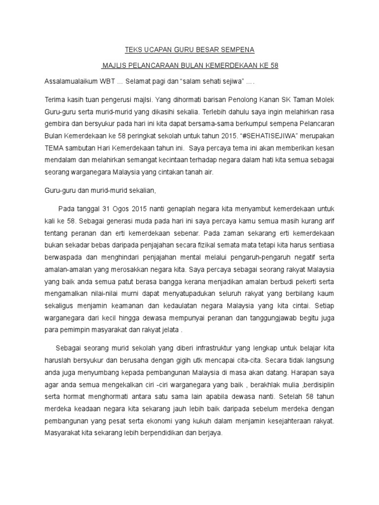 Teks Ucapan Guru Besar Sempena Majlis Pelancaraan Bulan Kemerdekaan Ke 58 Pdf